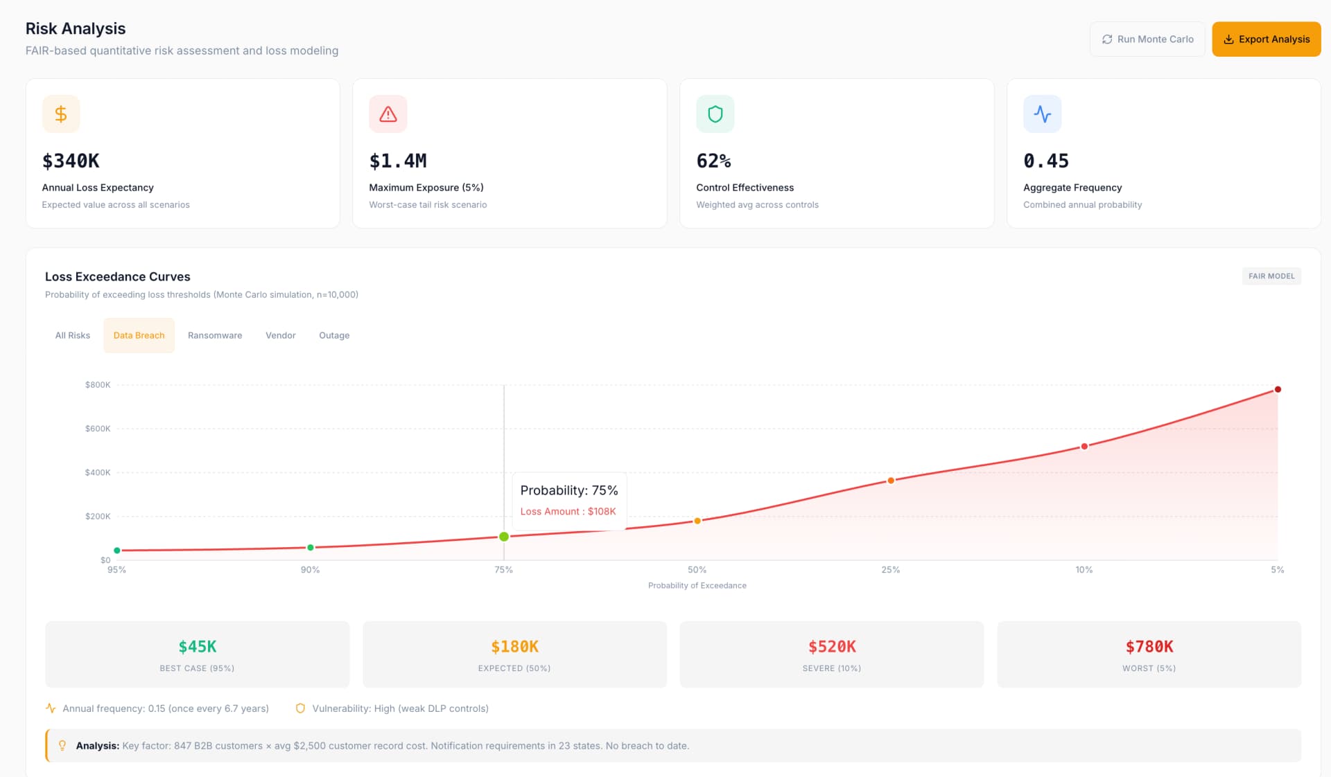 Walk into your next board meeting with answers, not excuses. Quantitative risk analysis powered by FAIR methodology and Monte Carlo simulations. Know your actual loss exposure— best case to worst case—so you can make decisions with real numbers, not gut feelings.